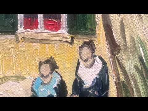 “De laatste studie die ik heb gedaan is een uitzicht op het dorp, waar ze aan het werk waren – onder enkele enorme platanen – de trottoirs herstellend. Er zijn dus hopen zand, stenen en gigantische stammen – de bladeren vergelen en hier en daar vang je een glimp op van een gevel en kleine figuurtjes.”
