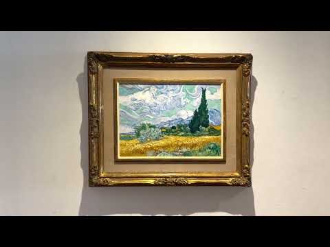 Voor deze geschilderde replica kozen wij een klein, charmant Spaans verguld lijstje uit de eerste helft van de twintigste eeuw. De verfijnde inleg geeft de lijst een bijzonder gevoel van diepte, wat prachtig aansluit bij het schilderij. Het warme goud heeft genoeg aanwezigheid om de gelen en groenen van het landschap te verrijken, zonder de onrustige elegantie van Van Gogh’s penseelstreken te overheersen.