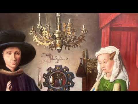Dit dubbelportret is meer dan een weergave van een welgesteld stel — het zit vol symboliek, van de enkele brandende kaars en bolle spiegel tot het fruit, het hondje en de kleding. Van Eycks handtekening boven de spiegel suggereert dat hij als getuige aanwezig was, wat het schilderij tot een mogelijk juridisch document maakt, een huwelijksceremonie — of misschien iets raadselachtigers.